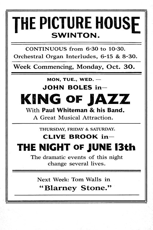 Cinema – Picture House – King of Jazz September 1903 South Yorkshire Times, October 27th 1933 From You Tube: