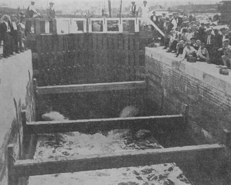 An interesting crowd watching the refilling of the Swinton locks last week after the canal had been emptied for repairs to the locks, the first at this point for thirty years.