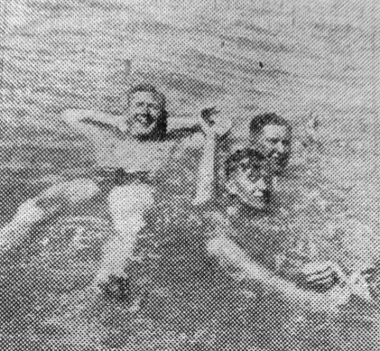 It is the Dead Sea in Palestine and seen reclining in its salty waters are Driver William Hebbs (on the left), of 51, White Lee Road, Swinton, and two of his Service pals.
