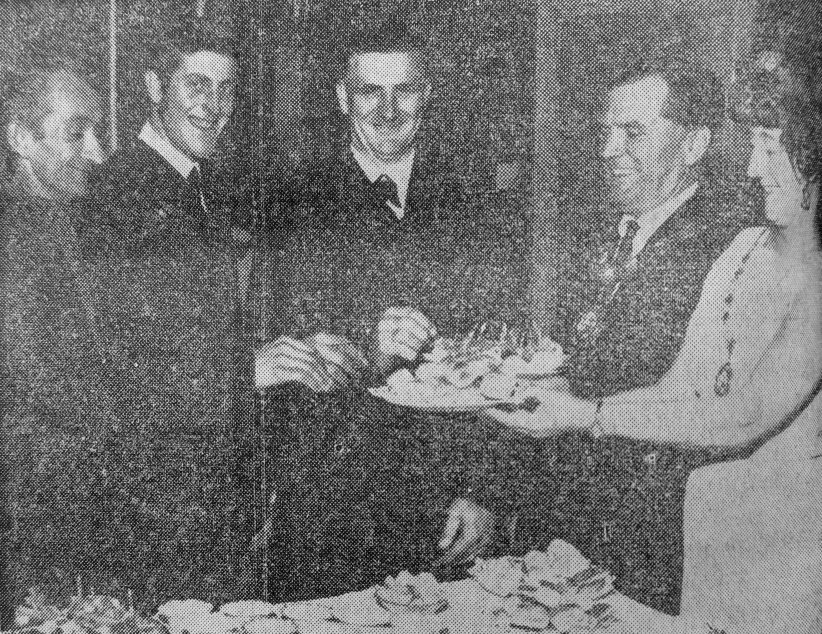 Coun. Jack Haythorne (chairman of Swinton Urban Council) and his wife, Marie, gave a buffet party for employees of Swinton Urban Council at Kilnhurst W.M.C. on Wednesday with them are Raymond Ellor, James Crawshaw and Horace Roberts.