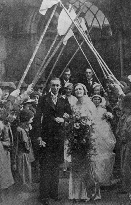 A wedding of unusual interest was solemnised at St. Margaret’s, Swinton, on Tuesday, when Miss Beatrice Sutcliffe, elder daughter of Mr. and Mrs. H. Sutcliffe, Wood Cottage, Piccadilly, Swinton, was married to Mr. John Carroll Wilkinson, youngest son of the late Mr. and Mrs. J. T. Wilkinson, of Swinton. The vicar, the Rev. T. G. Rogers, officiated. The service was fully choral, with Mr. H. D. Liversidge at the organ, and the hymns “He who would valiant be” and “Dear Lord and Father of mankind” were sung. The bride, who was given away by her father, wore a gown of deep ivory satin, modelled on medieval lines, with a charming veil of net and silver lace lent by Mrs. Crossland. She also wore pearls and carried a shower bouquet of pink roses. The bridesmaids, Miss Dora Sutcliffe (sister of the bride), Miss J. Bachelor (Collingham. Leeds) and Miss Betty Wilkinson (niece of the bridegroom), wore dresses of delicate tones in taffeta, of Victorian style, with tight bodices and full skirts, trimmed in a deeper shade of ribbon velvet. They wore deep capes and mittens and tiny caps of shaded flowers and carried posies of mauve and pink sweet peas.
